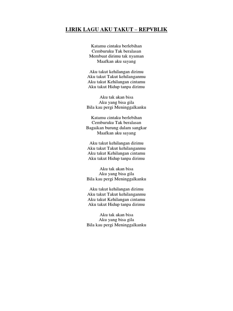 Up to 24 cash back Play and Download dj dj remix aku takut repvblik lirik katamu cintaku berlebihan cemburuku tak beralasan membuat dirimu tak nyaman maafkan aku sayang aku takut DJ REMIX AKU TAKUT KEHILANGANMU Mp3 Publish 2019-04-30 - Filetype. Katamu cintaku berlebihan Cemburuku tak beralasan Membuat dirimu tak nyaman Maafkan aku sayang Aku takut Kehilangan dirimu Aku Takut. Aku takut takut kehilanganmu.